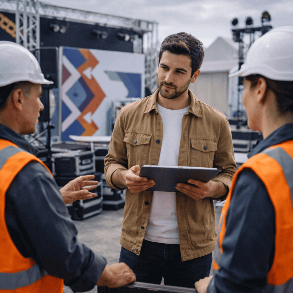Revisamos el plano del venue, las medidas del espacio asignado y las restricciones del evento. Esto define todo lo demás.